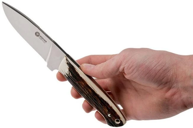The Böker Arbolito Dano Stag is an incredibly bold hunting knife with a distinct look. The drop-point blade is made from Böhler N695 steel. The Austrian equivalent of the famous 440C steel. The shape is perfect for cutting game. The handle is made from stag horn: a natural product, so variations between different models can therefore be possible. In between the handles and the blade you will find a red liner. You can see that this knife is made with South American charm. The hand of the master is clearly visible.