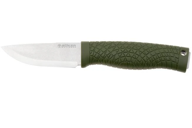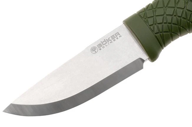 The blade of the Böker Manufaktur Bronco Mini Scandi 121518 Stonewashed 3V, Green TPE, bushcraft knife measures 8.8 cm in length and 3.5 mm in thickness. The total length is 20.8 cm.