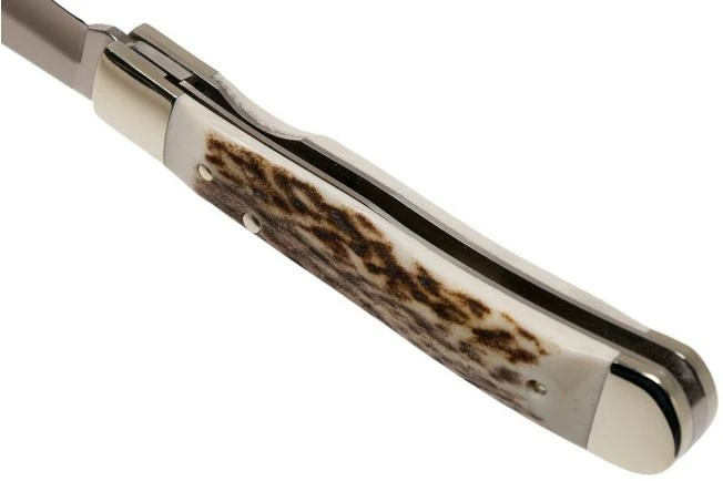The Böker Trapperliner Stag 110254 is a traditional pocket knife with a Trapper shape. Compared to many traditional Trapper pocket knives this knife is not enhanced with a slipjoint, but a linerlock. When opened this lock will block the blade. You open the blade with the nailnick.